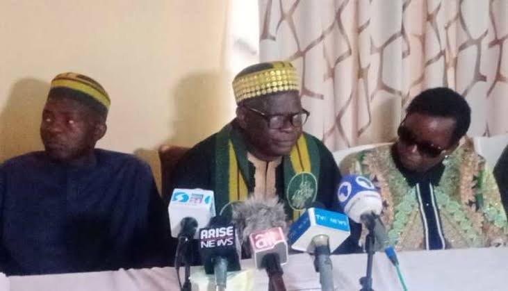 Sir Joseph Gwankat Flanked by other Executive of the Mwaghavul Development Association addressing newsmen at the Press Centre in Jos