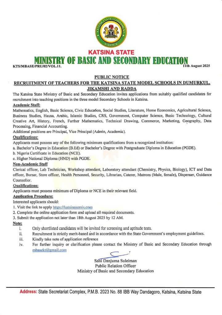 Checks by this medium indicates that the Katsina State Government, through the Ministry of Basic and Secondary Education, has issued an official communication signed by the Ministry’s Public Relations Officer, Sani Danjuma Suleiman, inviting applications from suitably qualified candidates for teaching positions in the three state-owned model schools.